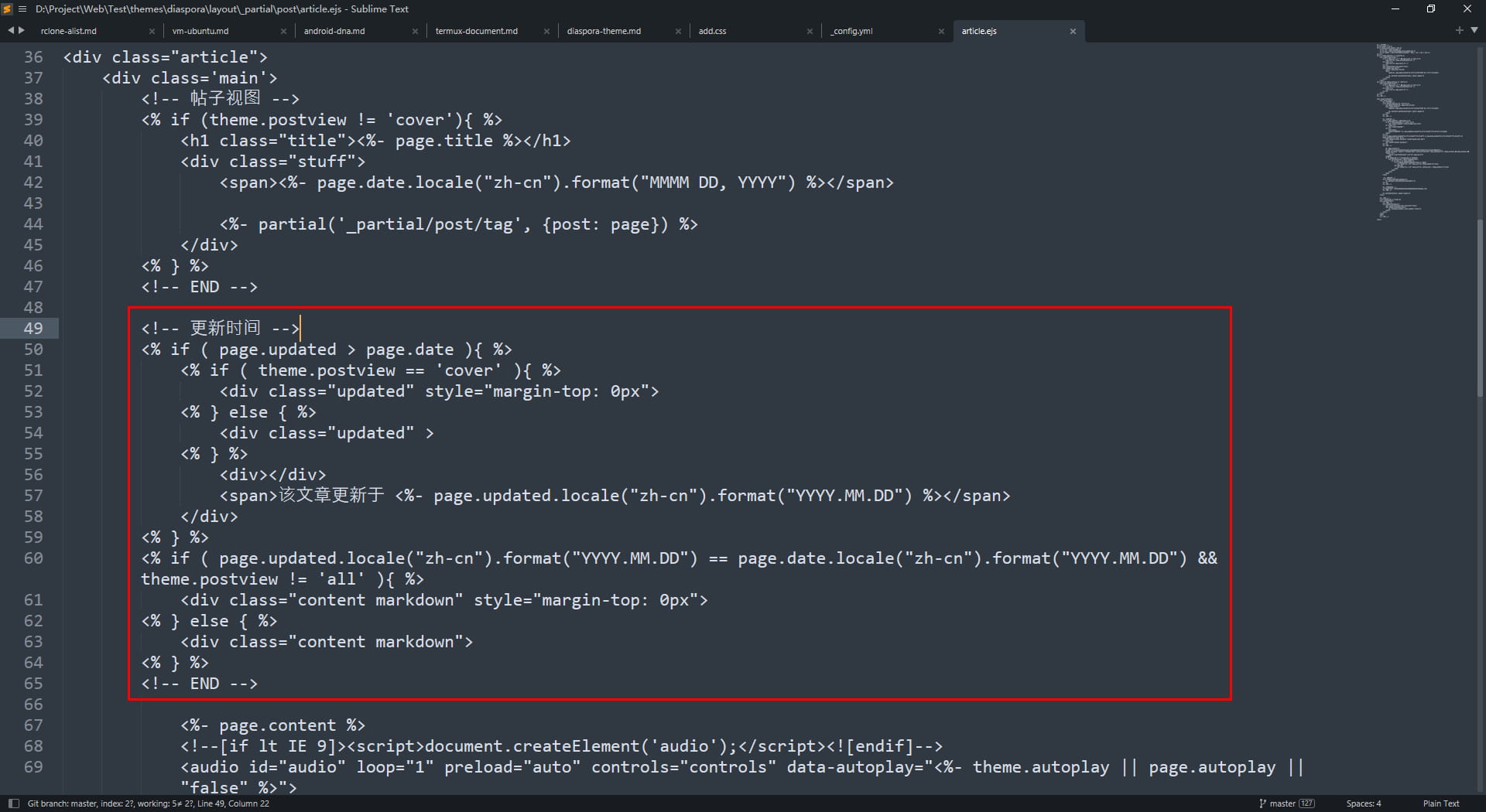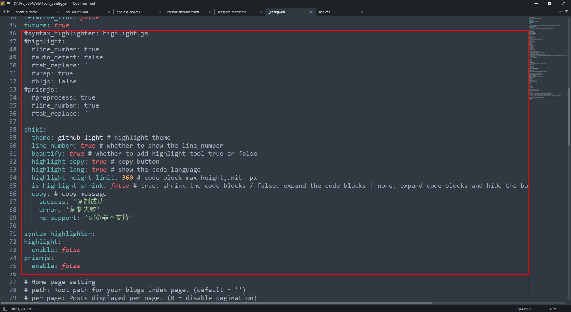 Blogroot,主题根目录为 ThemerootSublime TextThemeroot/_config.yml,在里面添加配置1