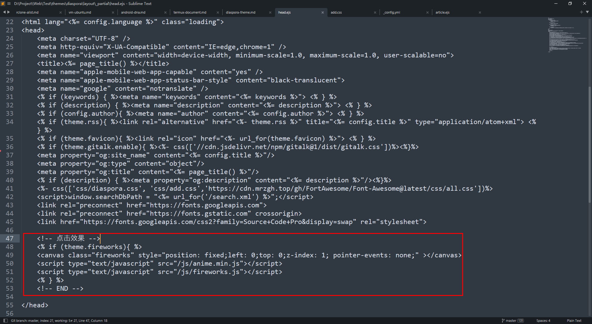 Themeroot/layout/_partial/head.ejs ,找到 <%- css(['css/diaspora.css', 'css/add.css'])%> ,修改为下面代码1